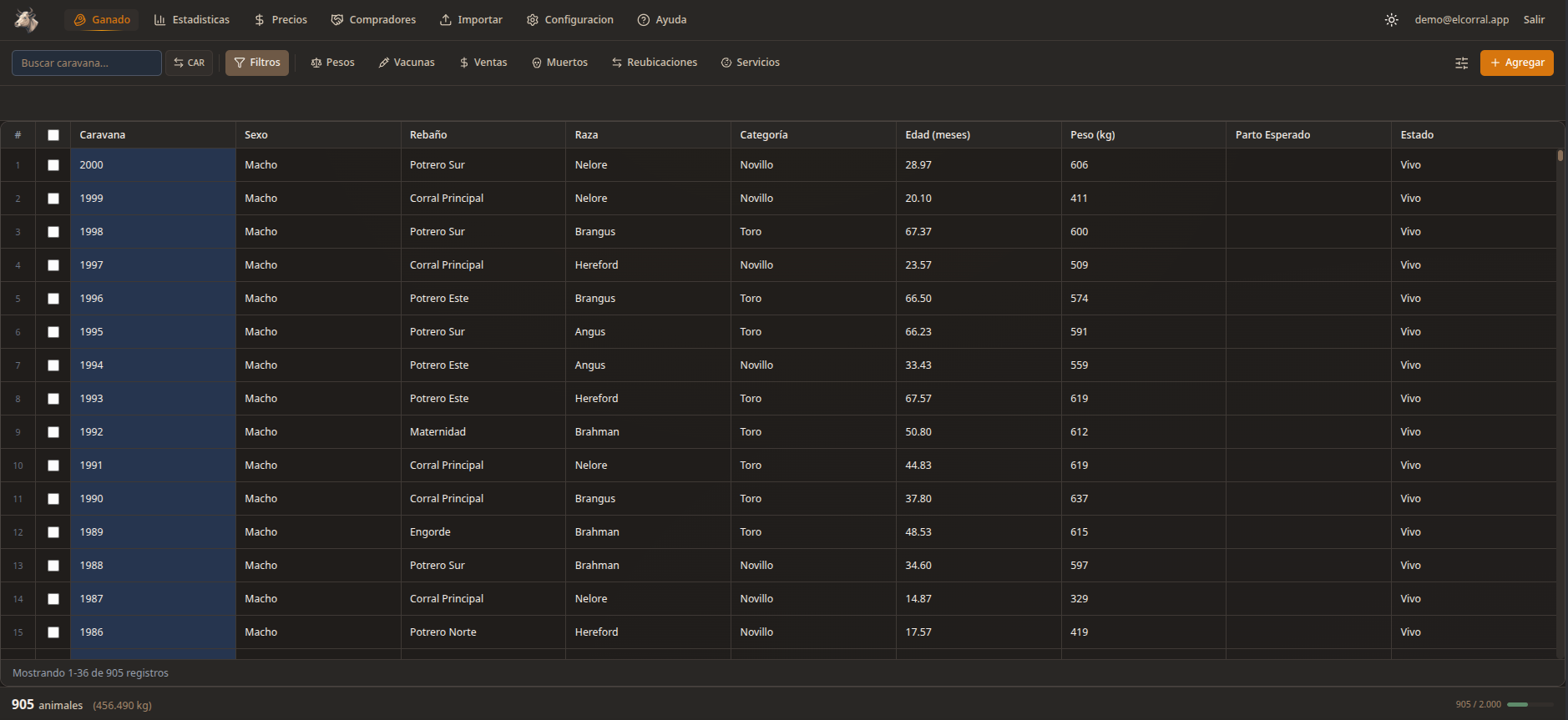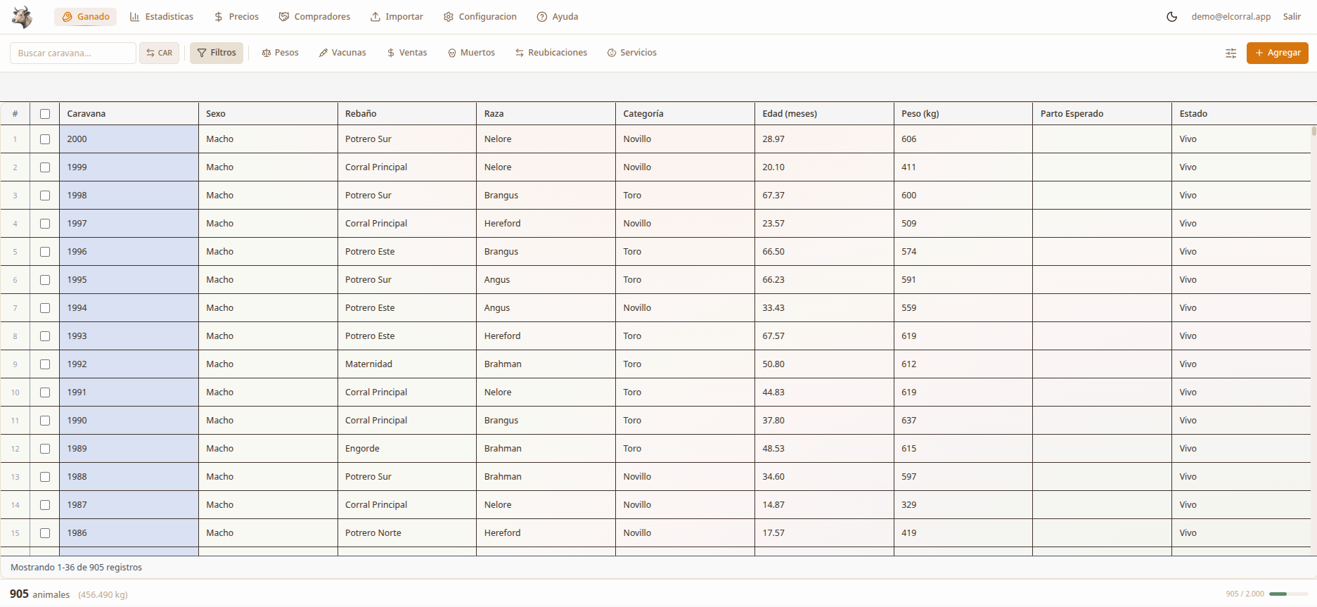 Crea sesiones de pesaje y vacunación. Registra ventas y muertes. El sistema mantiene el historial completo de cada animal.