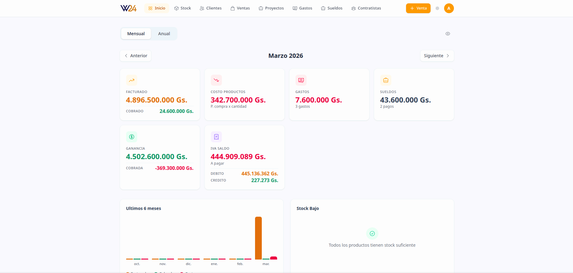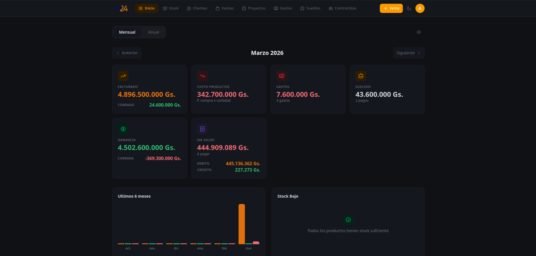 Dashboard mensual y anual con facturado, cobrado, costos, gastos, sueldos, IVA y productos con stock bajo.
